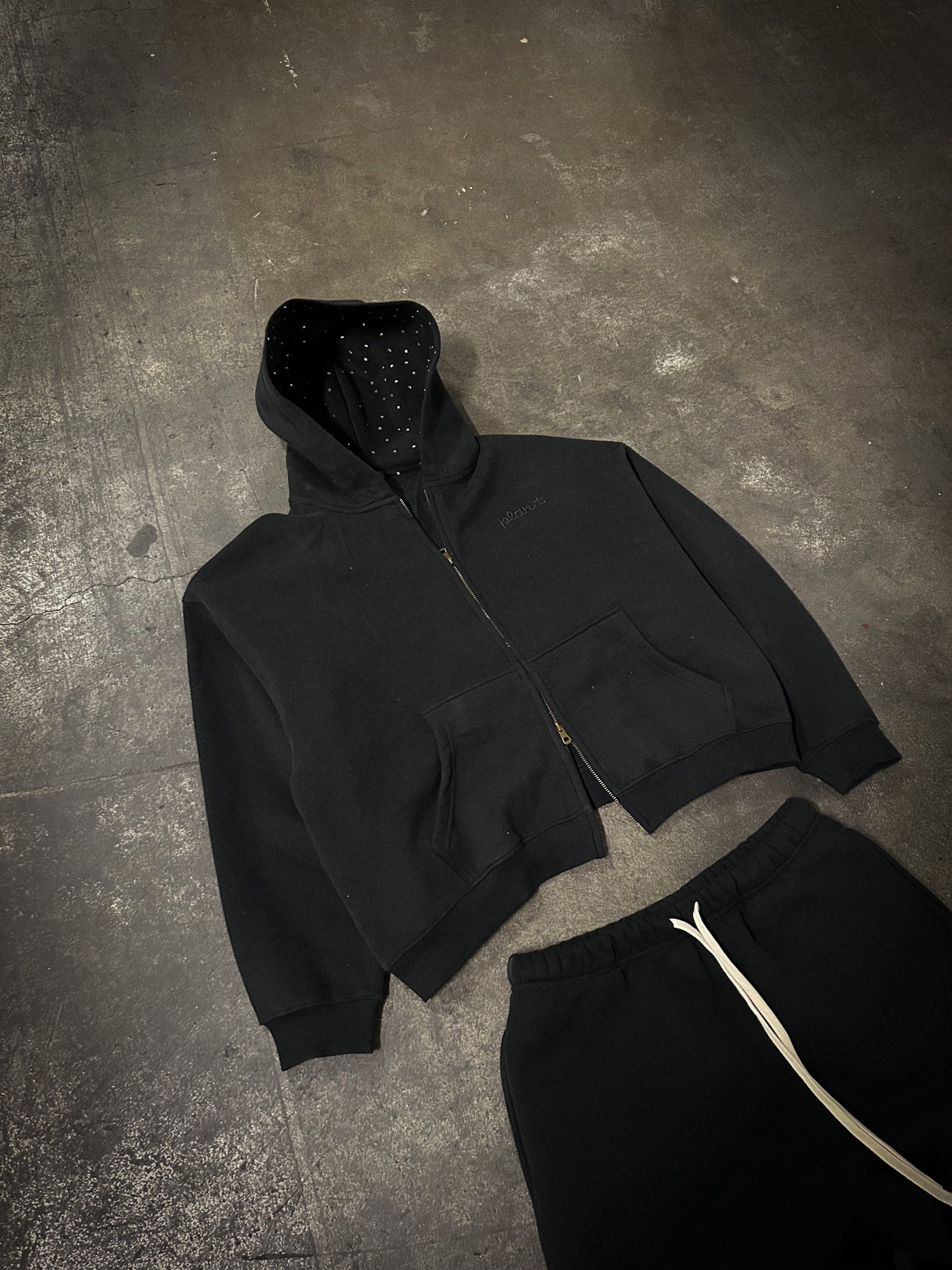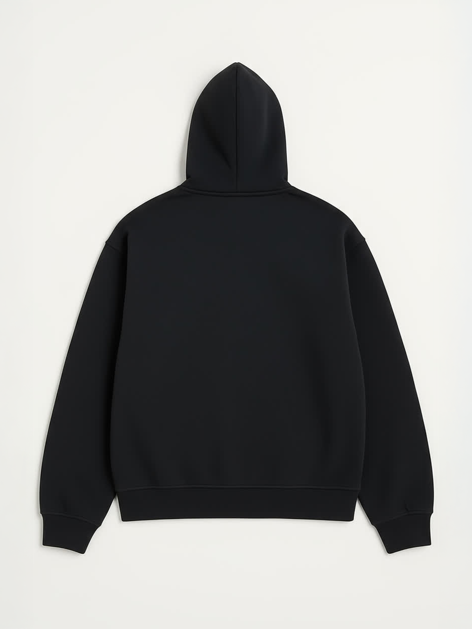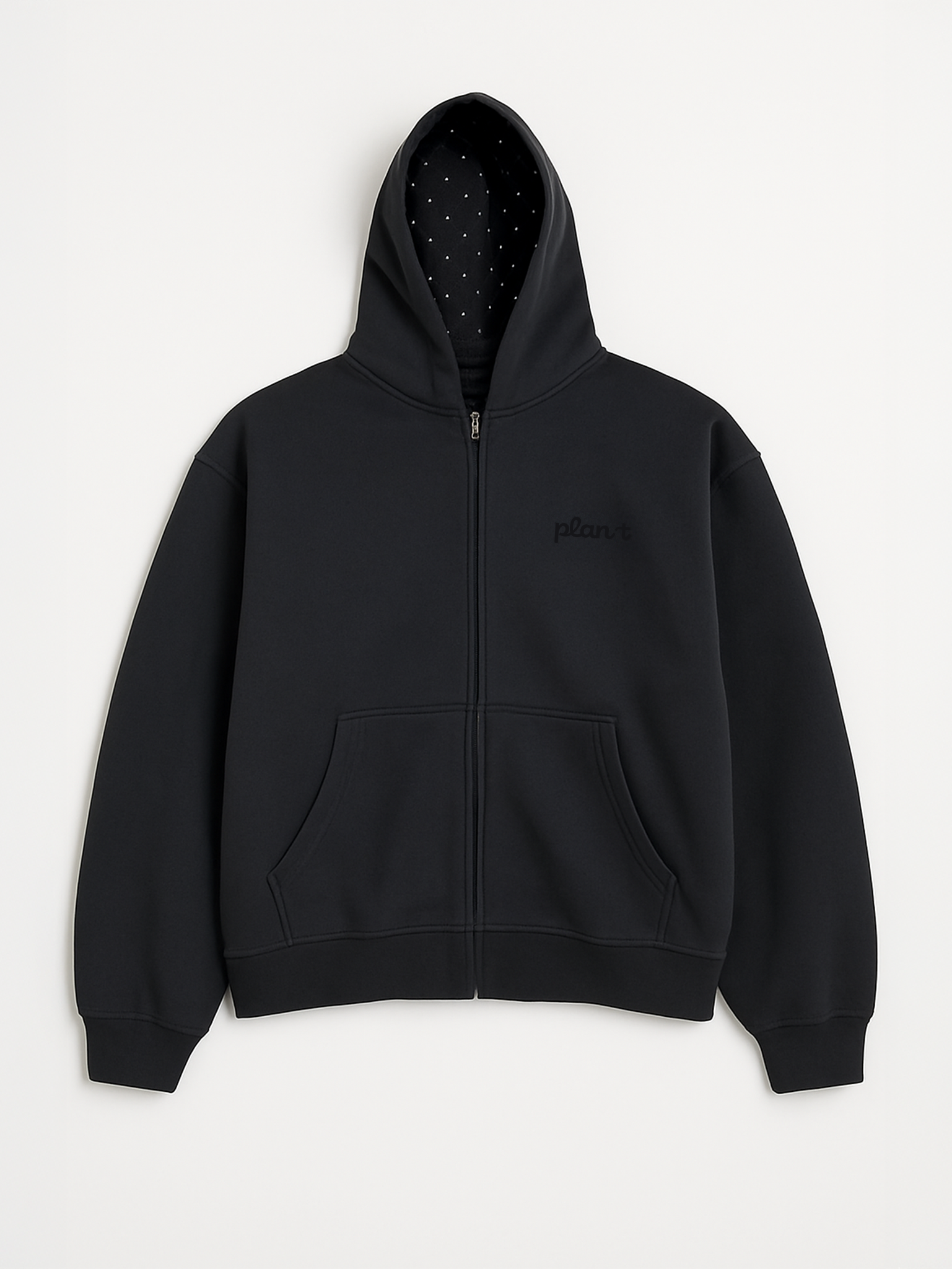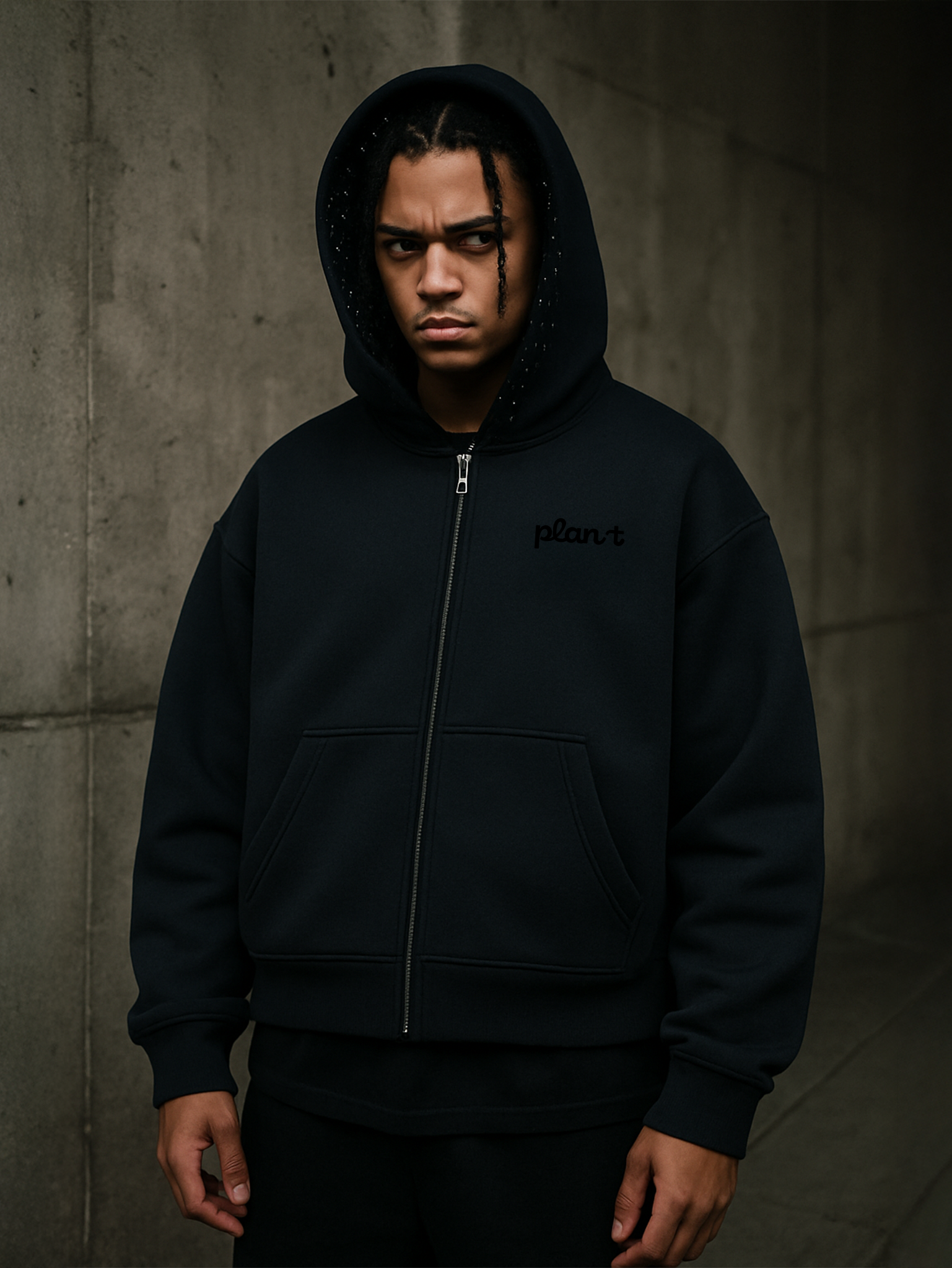 קפוצ’ון בוקסי (Boxy Fit) עשוי בד עבה ואיכותי במרקם רך ומאוזן, עם רוכסן קדמי מלא וכיסי קנגורו רחבים. הקפוצ’ון הפנימי מעוטר בנקודות יהלום עדינות בהשראת תקרת ה־Rolls Royce, שמעניקות טאץ’ ייחודי ואלגנטי. על החזה רקמת Plan T בגודל 7 ס״מ באותו גוּון בד ( שחור על שחור) למראה נקי ומודרני