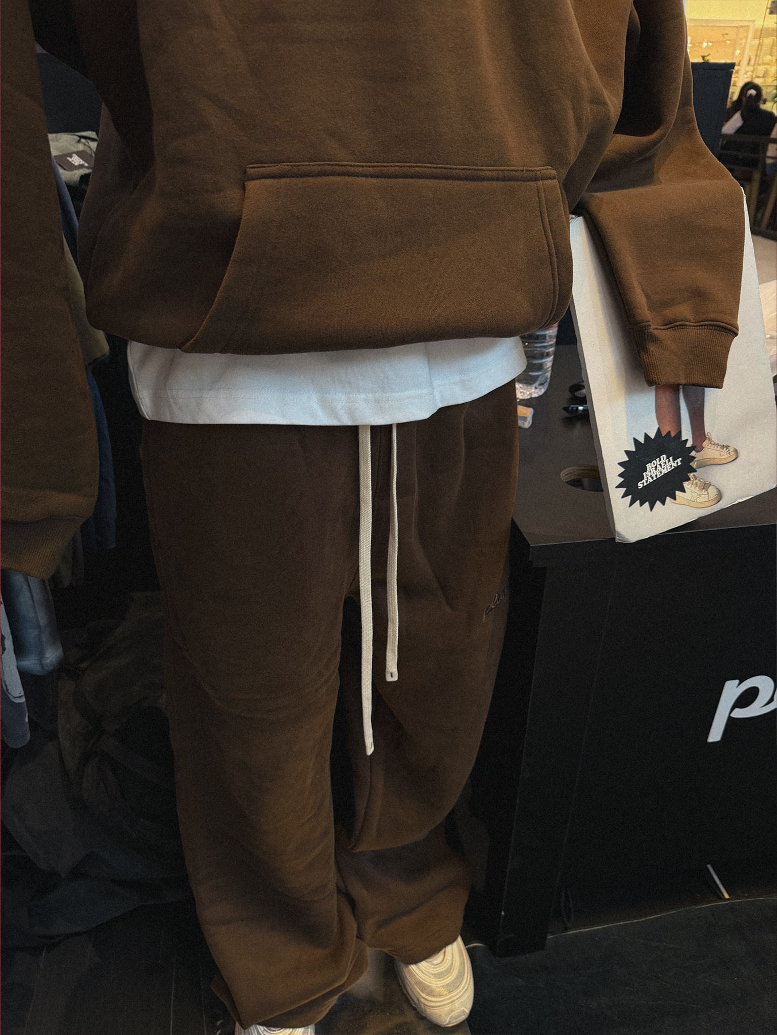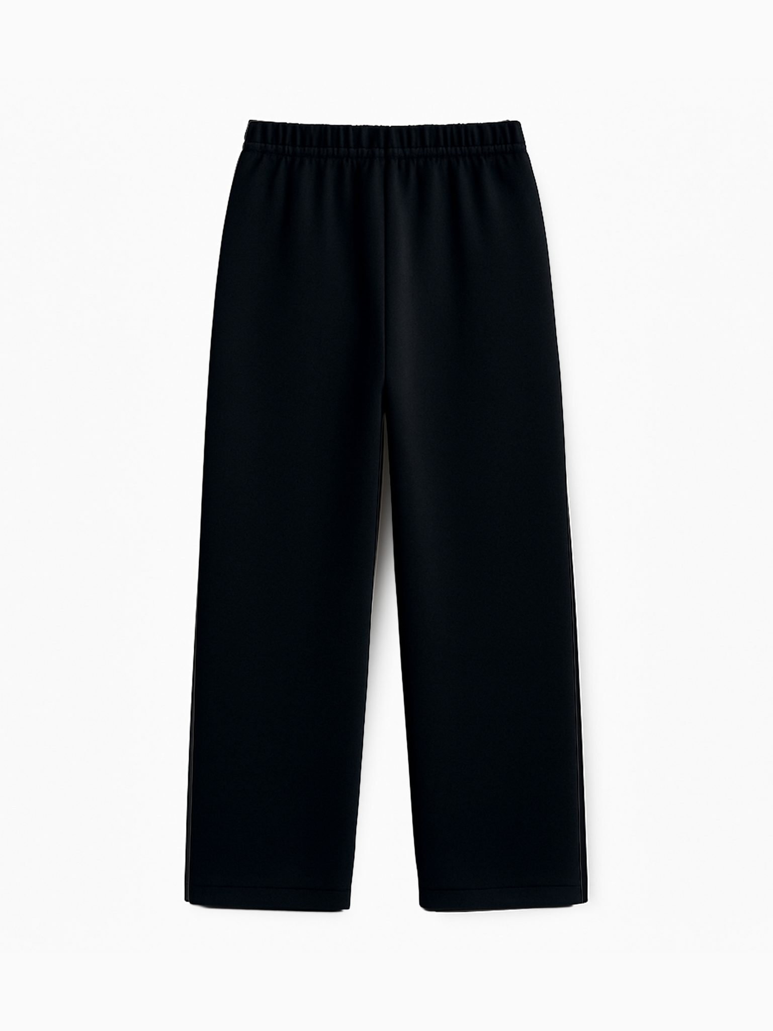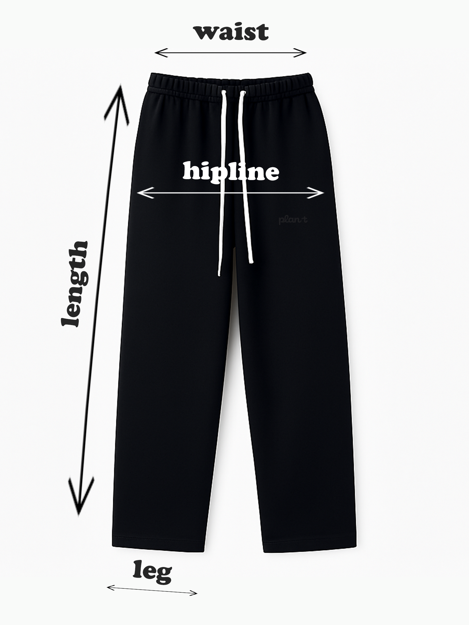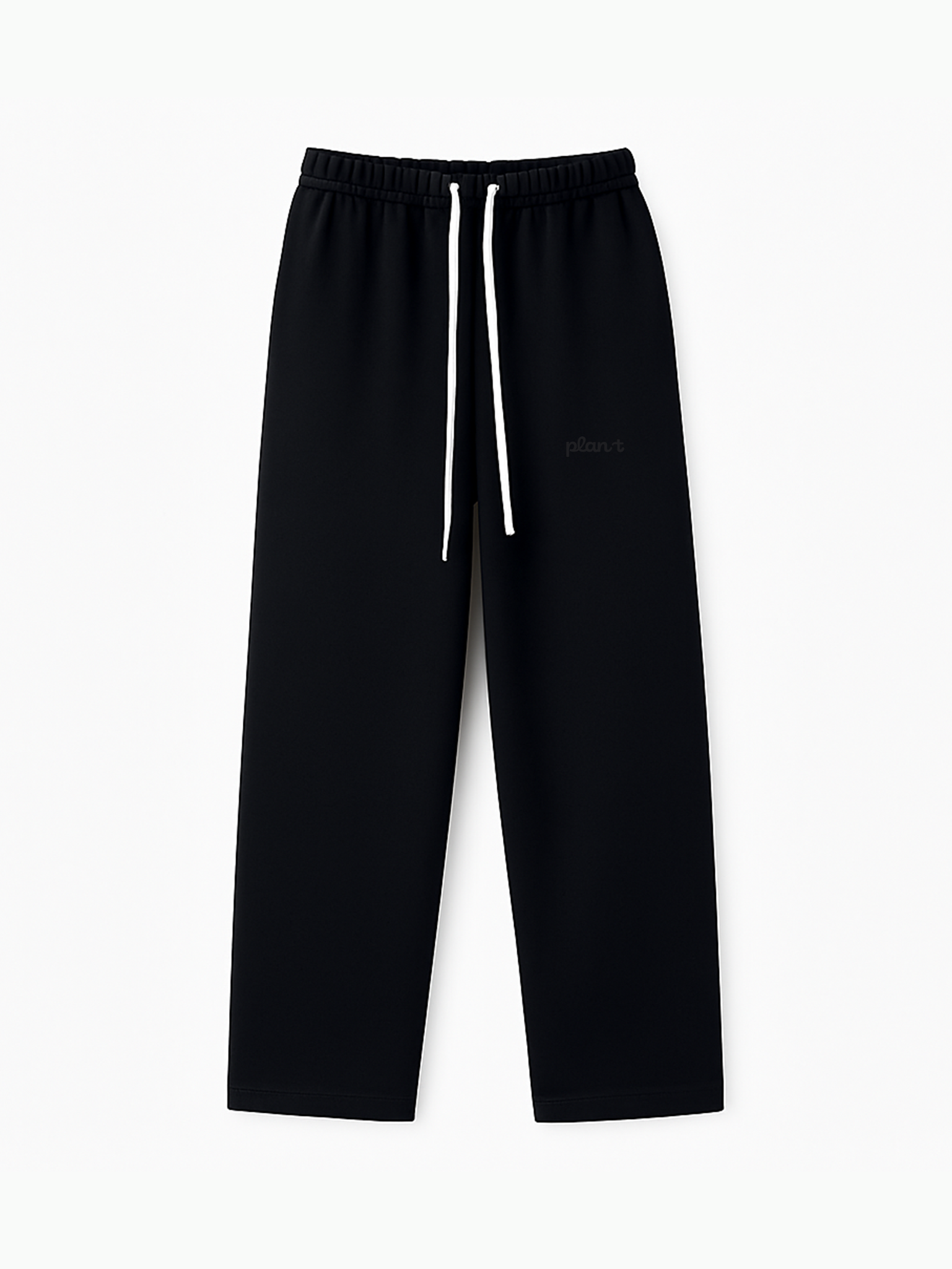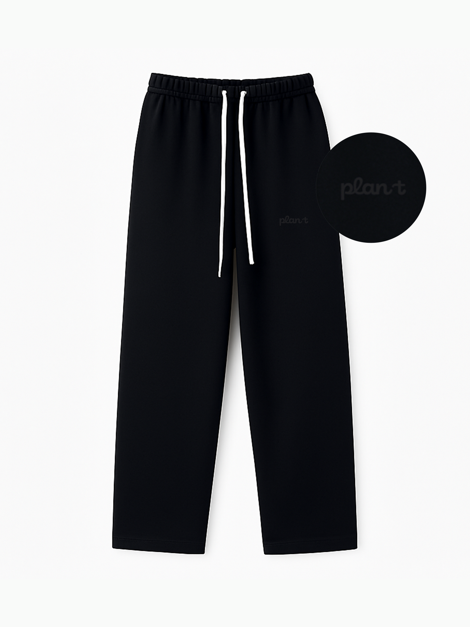 עשוי בד פליז 350 GSM בגזרה oversized רחבה בתחתית, עם גומי במותן ושרוכים לבנים עבים (20-25 ס״מ) בגימור סיליקון. רקמת Plan T שחורה על בד שחור למראה נקי ומאוזן. הבד רך על הגוף ומטרתו להישמר להרבההה זמן בארון (גם הז'קט ובכללי כל הבגדים שלנו 🥷🏾)