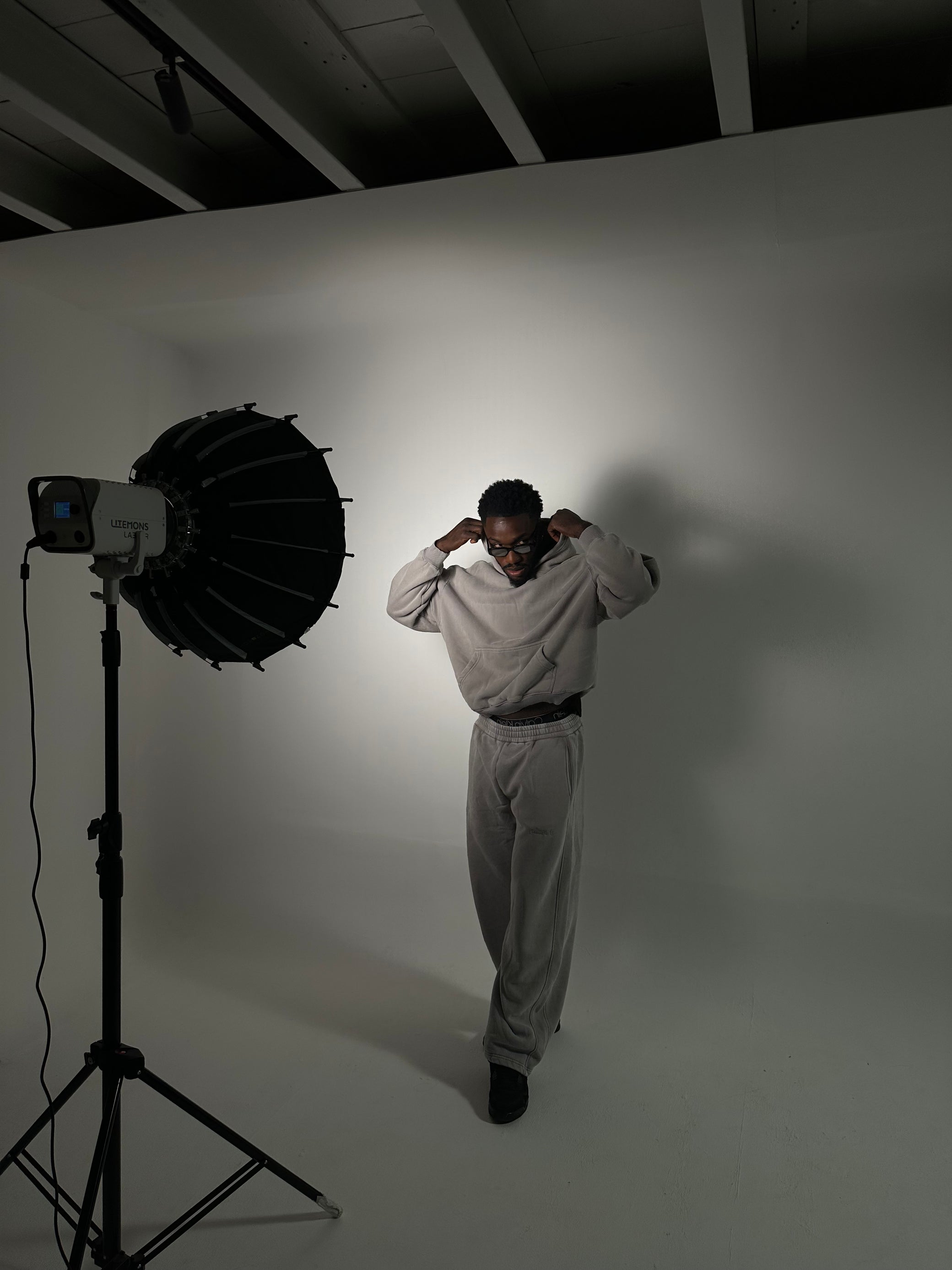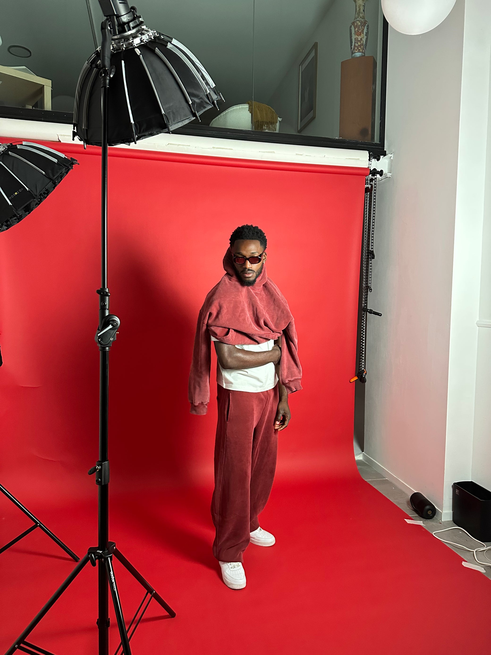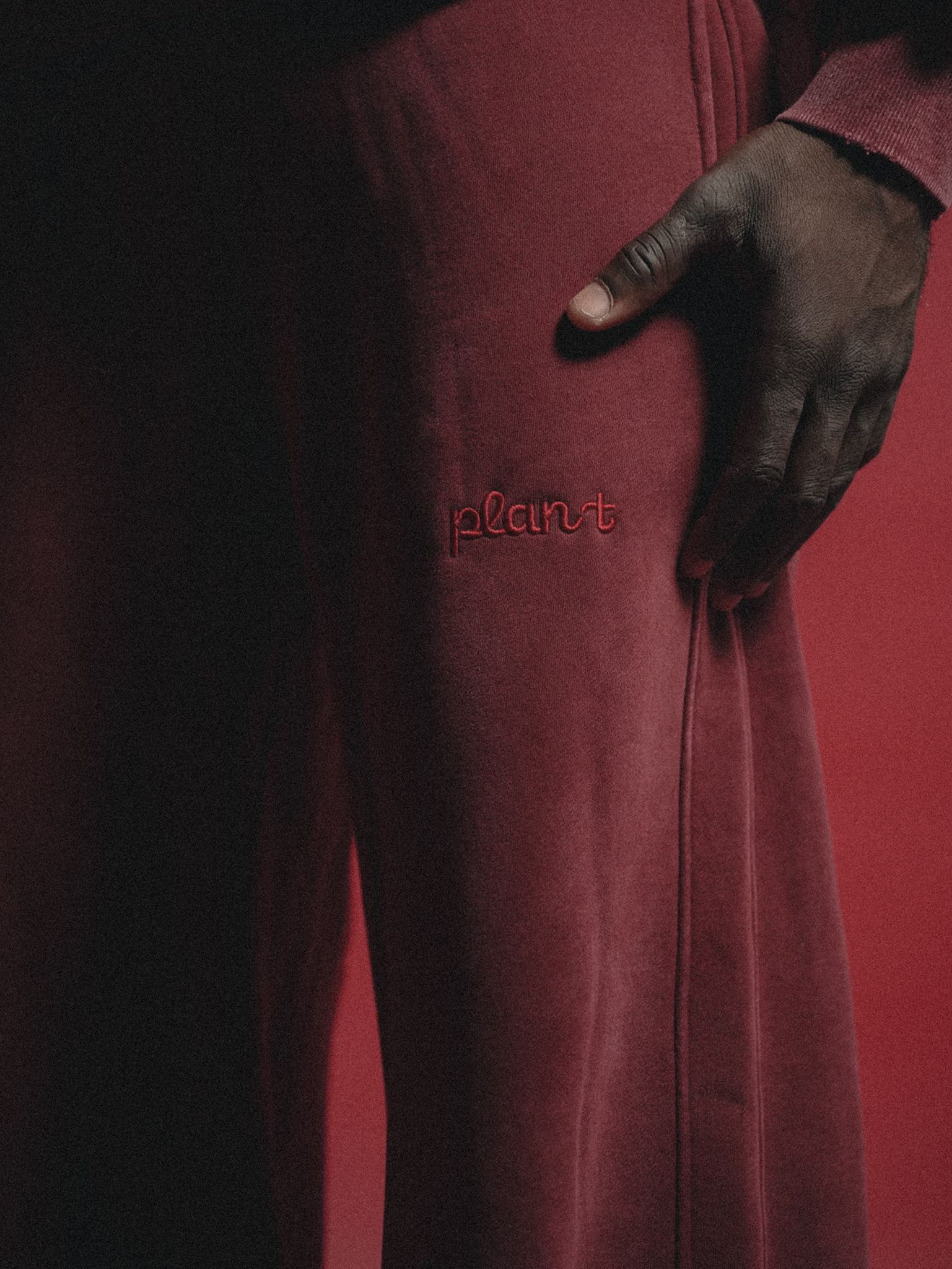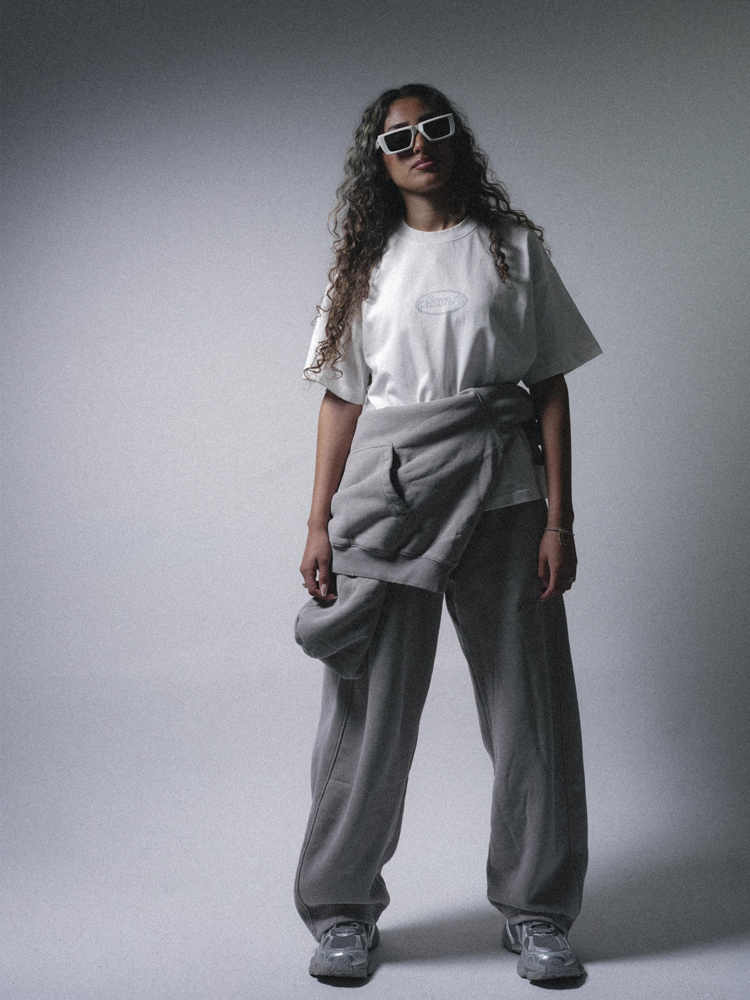 עשוי בד פליז 350 GSM בגזרה oversized רחבה בתחתית, עם גומי במותן ושרוכים לבנים עבים (20-25 ס״מ) בגימור סיליקון. רקמת Plan T שחורה על בד שחור למראה נקי ומאוזן. הבד רך על הגוף ומטרתו להישמר להרבההה זמן בארון (גם הז'קט ובכללי כל הבגדים שלנו 🥷🏾)